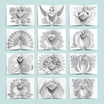 Coffret de 12 cartes pop-up à fabriquer soi-même. Chaque carte représente un animal à colorier et dispose d'un espace dédié pour écrire un mot personnalisé. Le montage pop-up est simple et ne nécessite qu'une paire de ciseaux (non incluse dans le kit). Contenu réservé à un usage personnel, toute reproduction est interdite.